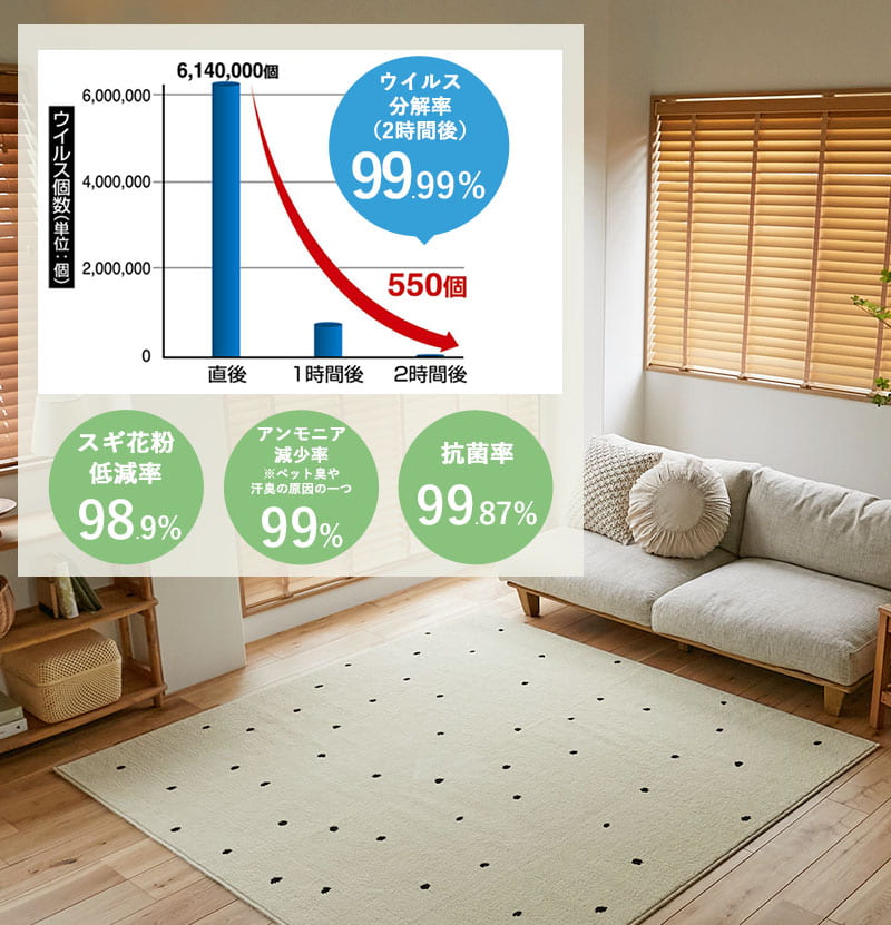 ※(※1)本商品の抗ウィルス加工は食品添加物に認可されている成分で構成され、細菌・ウイルス・アレルゲン・臭い(細菌由来)等のタンパク質を吸着分解する技術です。