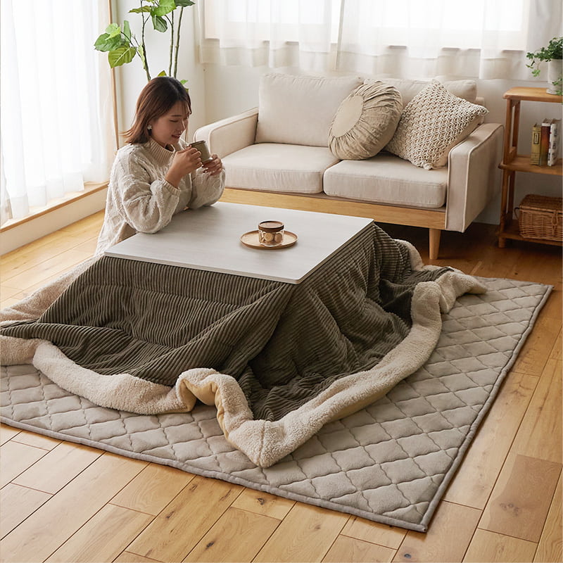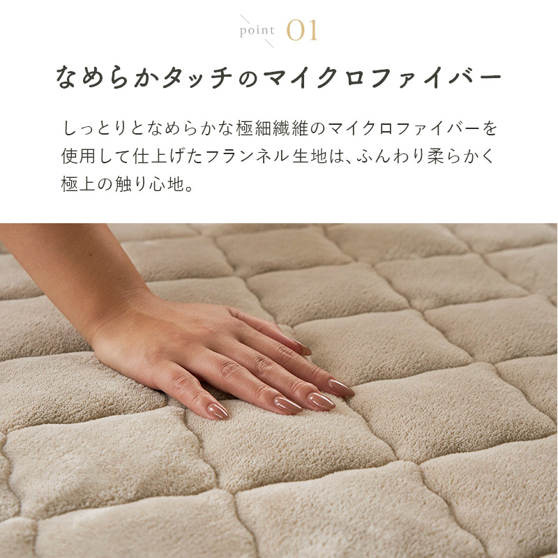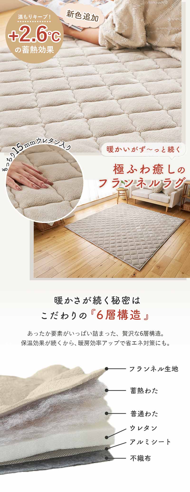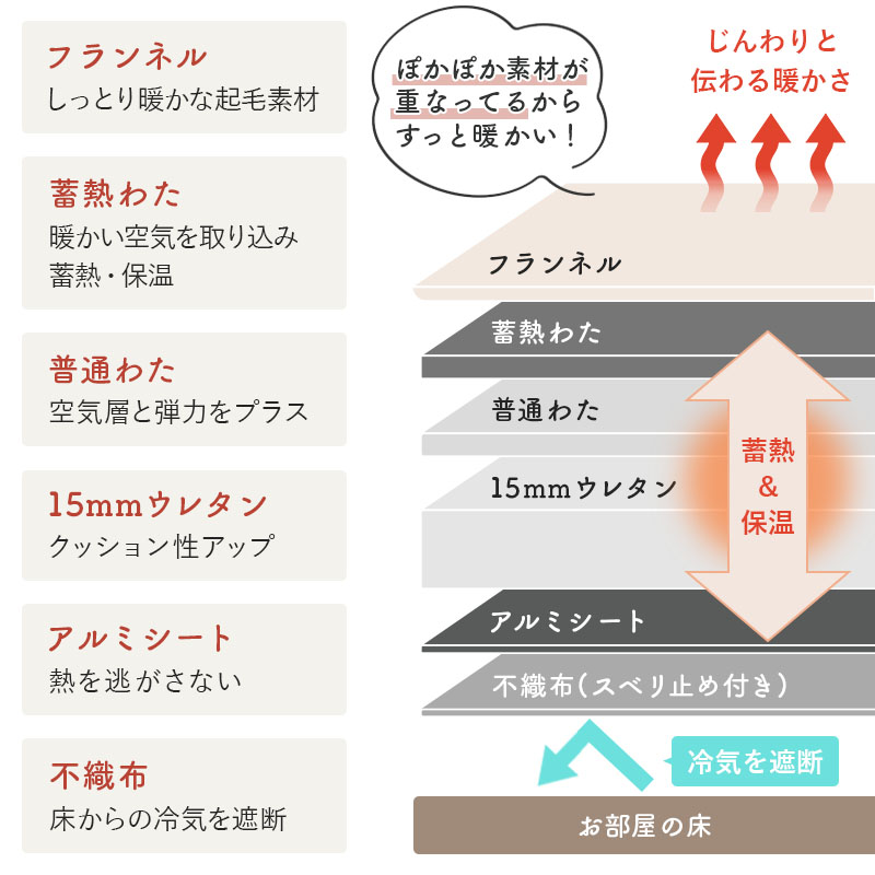 不織布と蓄熱綿が熱を逃がさずに保湿し、アルミシートが床からくる冷気をシャットダウンするので、暖かさかが続きます。