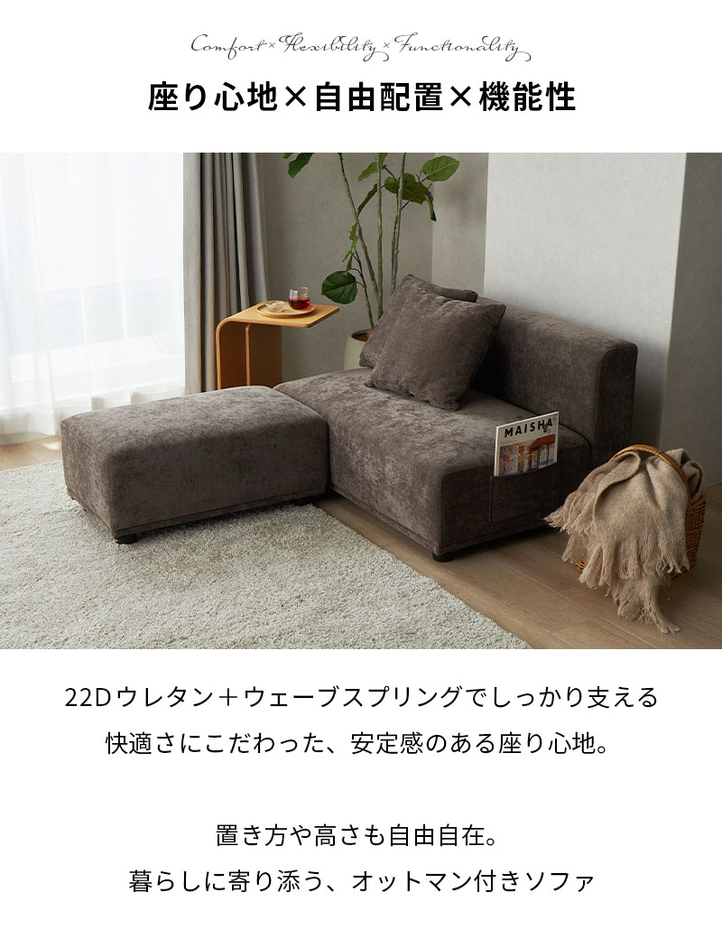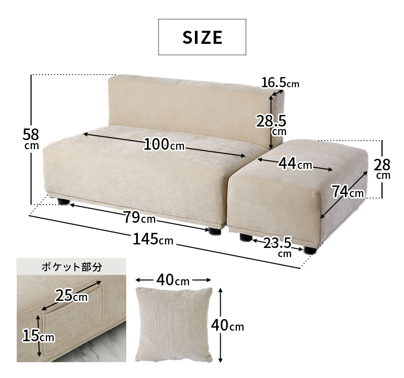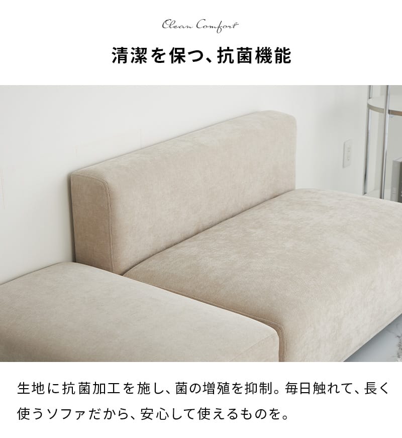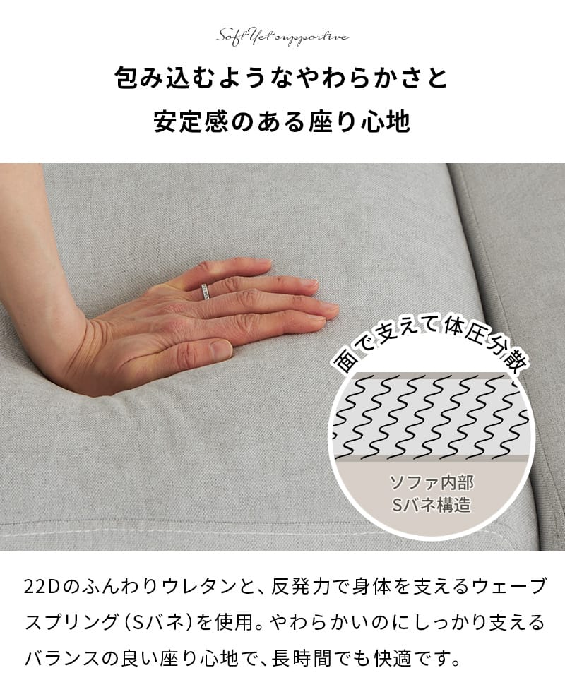 | 素材 | 表面生地:ポリエステル100% 中材:22Dウレタン、Sバネスプリング、木製フレーム 脚部:プラスチック |