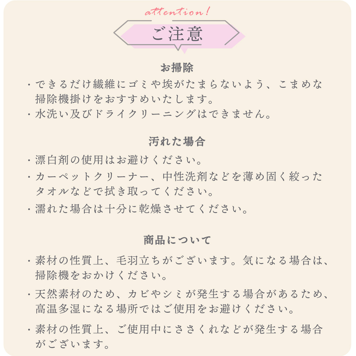 ※汚れた場合、漂白剤などの使用は避け、硬く絞った雑巾などでふき取り十分に乾かして下さい。